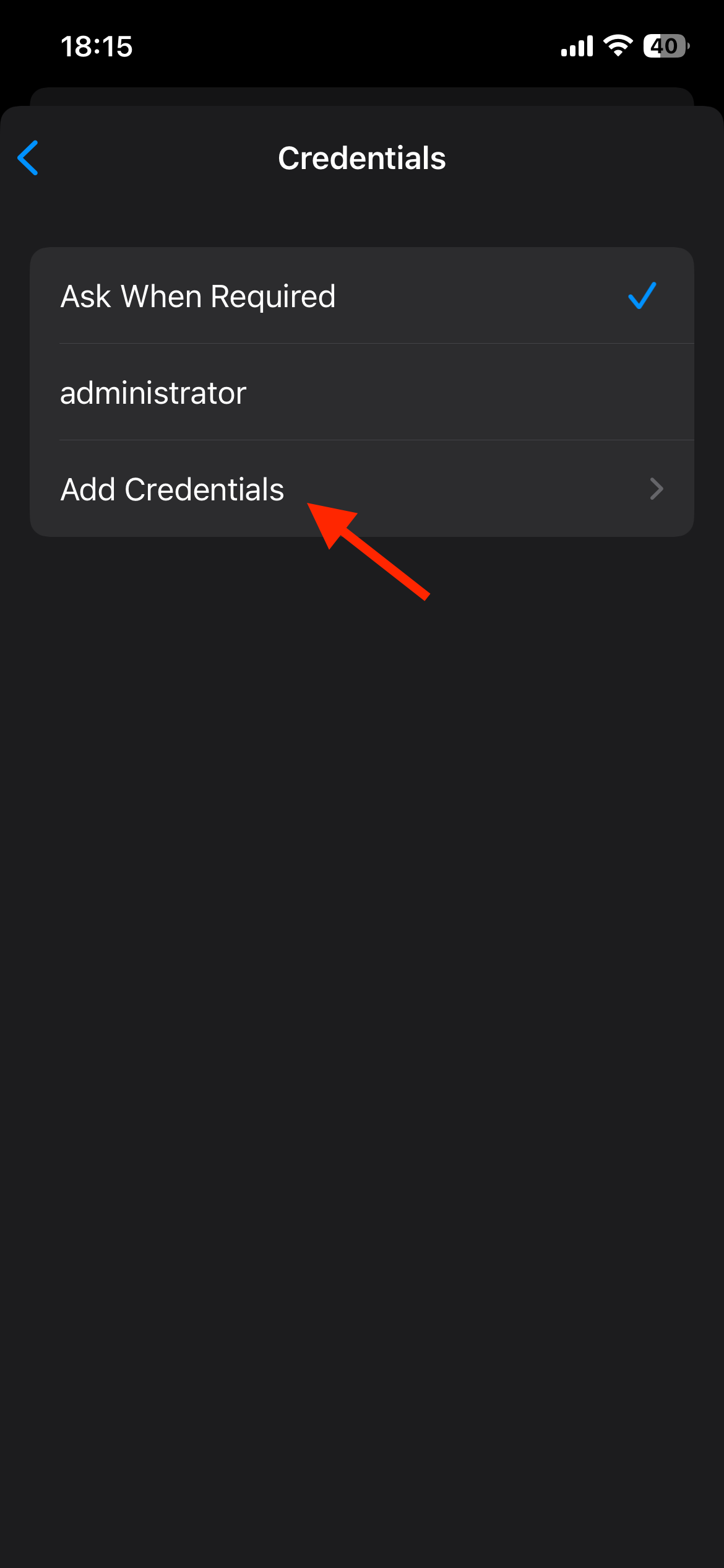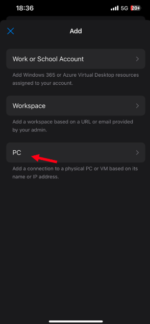 กด + (Add) แล้วเลือก PC connection เพื่อเริ่มเพิ่มเซิร์ฟเวอร์ VPS